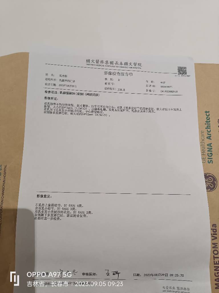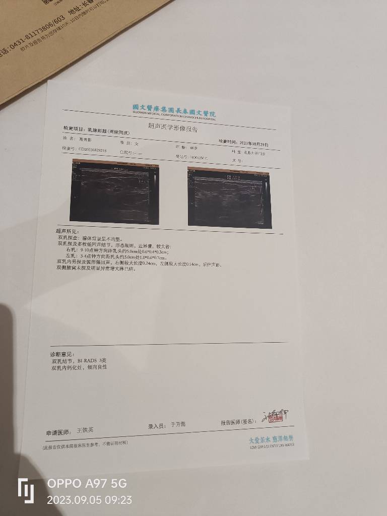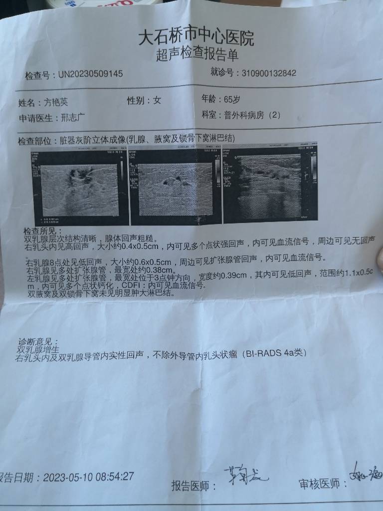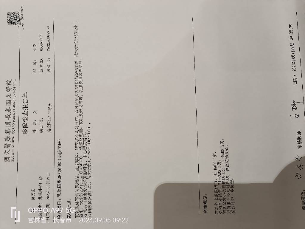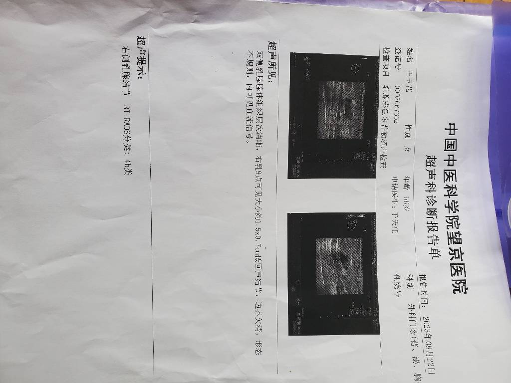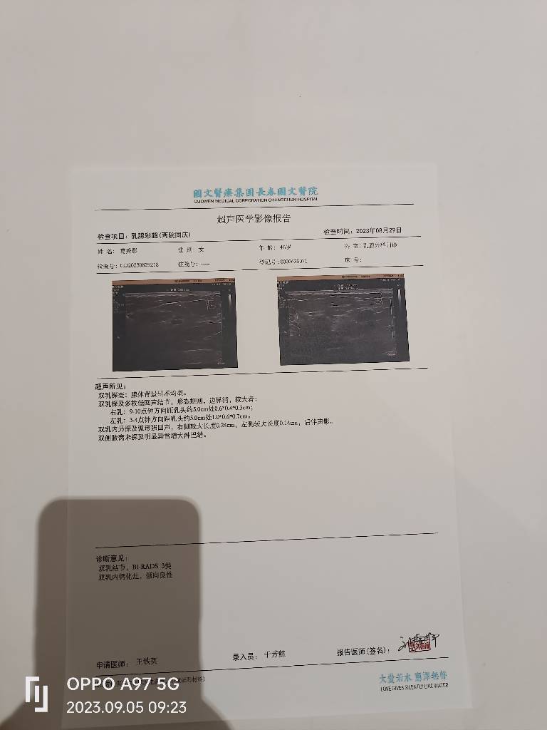 请您来我院完善乳腺彩超及乳腺钼靶,携带既往相关检查(乳腺彩超及乳腺钼靶)。-2023-09-04 04:33:59