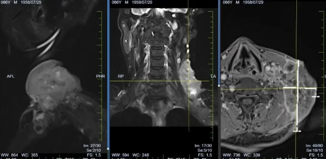 回忆起在长春国文医院初诊时的困境,李先生仍心有余悸:左颈部 8×10cm 的肿块已经破溃流脓,连咽口水都像 “吞玻璃碴”,体重骤降 10 斤。于头颈食管肿瘤放化疗病区检查后,他被确诊为食管恶性肿瘤伴颈部淋巴结转移,还合并脑部腔隙性梗塞灶,情况危急。