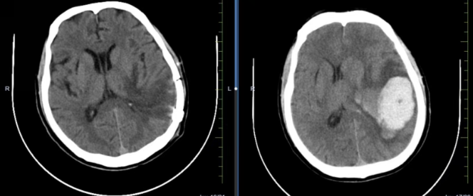 神经外科医师紧急会诊评估:患者深度昏迷,双侧瞳孔不等大,对光反射迟钝。这些是神经急危重症的典型表现。时间就是生命,医院第一时间启动急危重症应急预案,开通绿色通道。头颅CT检查迅速明确了病因:左侧颞顶叶脑出血,并已出现脑疝迹象。