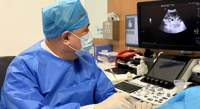 术中,超声设备清晰呈现肾脏囊肿的位置、大小及毗邻关系,超声科主任刘永红凭借丰富经验和精准操作,顺利完成穿刺并成功置管。